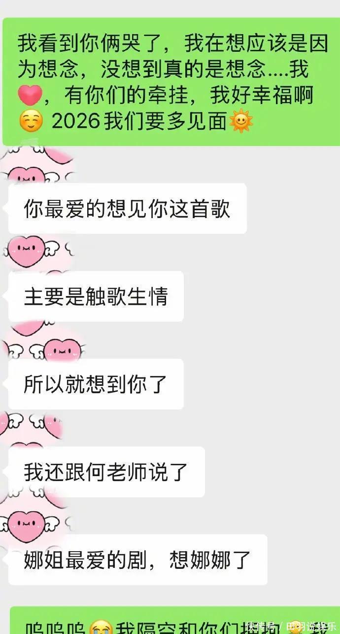 这一幕瞬间击中了无数观众柔软的内心,#何炅维嘉哭了#的话题随后迅速登顶热搜。大家都在猜测,究竟是什么触动了这两位主持人的心弦?1月1日,谢娜在微博上揭开了谜底,分享了这份属于2026年的第一份温暖。她在微博中晒出了几张聊天截图,配文道:“和嘉哥在群里聊天,突然知道了昨晚这张照片背后的故事,好友的想念和牵挂,好温暖好感动好幸福。”原来,这一切都源于一场深情的“想念”。《想见你想见你想见你》正是谢娜最喜爱的一首歌。当维嘉在现场听到这熟悉的旋律,触景生情,满脑子都是未能同台的谢娜,思念瞬间化作了止不住的泪水。